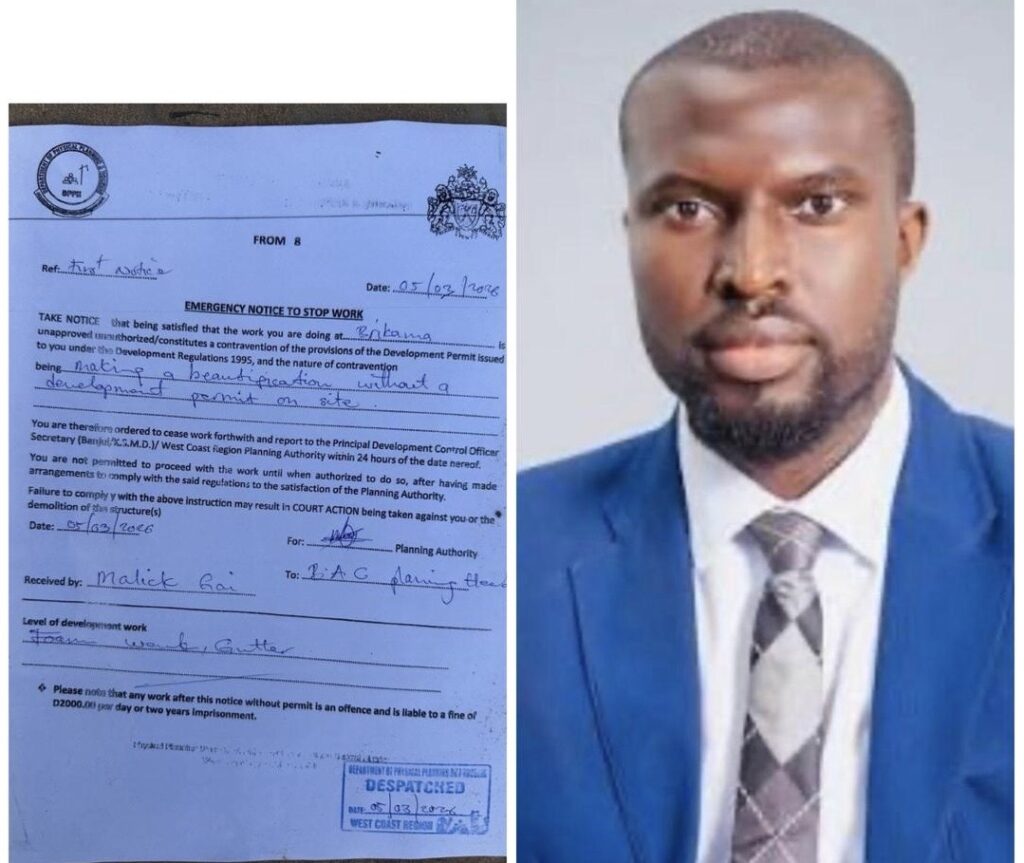According to the notice, the department said it was “satisfied that the work you are doing at Brikama is unapproved, unauthorized, and constitutes a contravention of the provisions of the Development Permit issued to you under the Development Regulations 1995.”