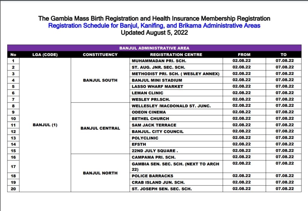 An updated schedule later shared by the Ministry of Health on 5th August 2022 for the mass registration for the National Health Insurance Scheme (NHIS)said registration started on 2nd August in the Greater Banjul Area.