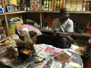 Sainey Faye’s small shop, lost in the maze of the Serrekunda market, at the beginning of a narrow, dark, covered aisle, offers a wide range of soaps, traditional care products and honey. A young woman is breastfeeding on a small bench on the side inside this small business of barely 5 square metres. With wide shoulders and muscular arms, Sainey Faye has a strong physique and a face with harmonious features, which give an equal impression of strength. His upper eyelids, whose swelling gives the feeling of half closing his eyes, give his look an attractive depth that is reinforced by a generous smile. If Batch Samba Jallow, although simple and modest in appearance, has the confidence and eloquence of a teacher, Sainey Faye has the restraint and temporary shyness of a small trader.